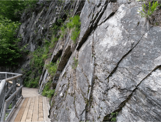 Unterschiedliche Gesteinsarten der Schlucht erzählen von der plattentektonischen Geschichte und Entstehung: